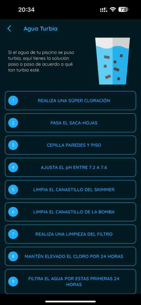 Hemos creado una herramienta que te brinda la solución PASO A PASO para la gran Mayoría de Problemas que se presentan con tu Alberca, todo en una sola App para que NUNCA TENGAS QUE MEMORIZARTE NADA.